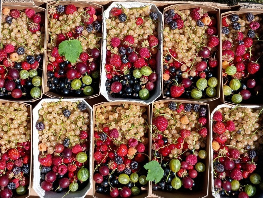 Johannisbeeren (rot, weiß, schwarz), Brombeeren, Himbeeren (rot, schwarz), Stachelbeeren (rot, grün), Jostabeeren.